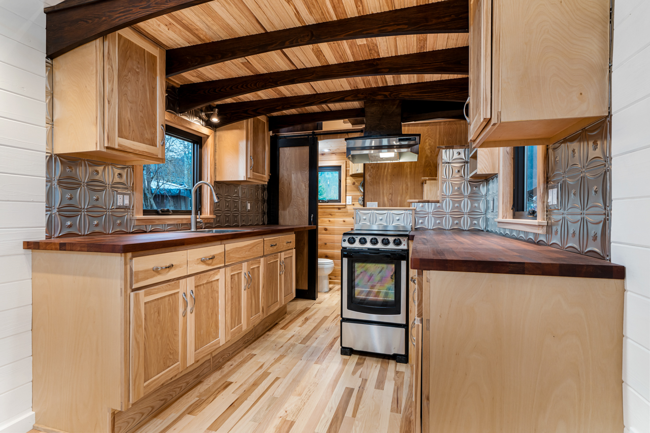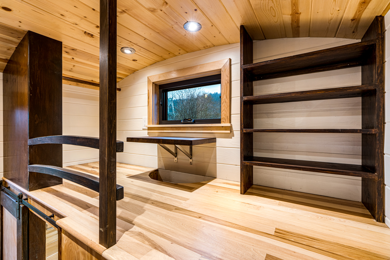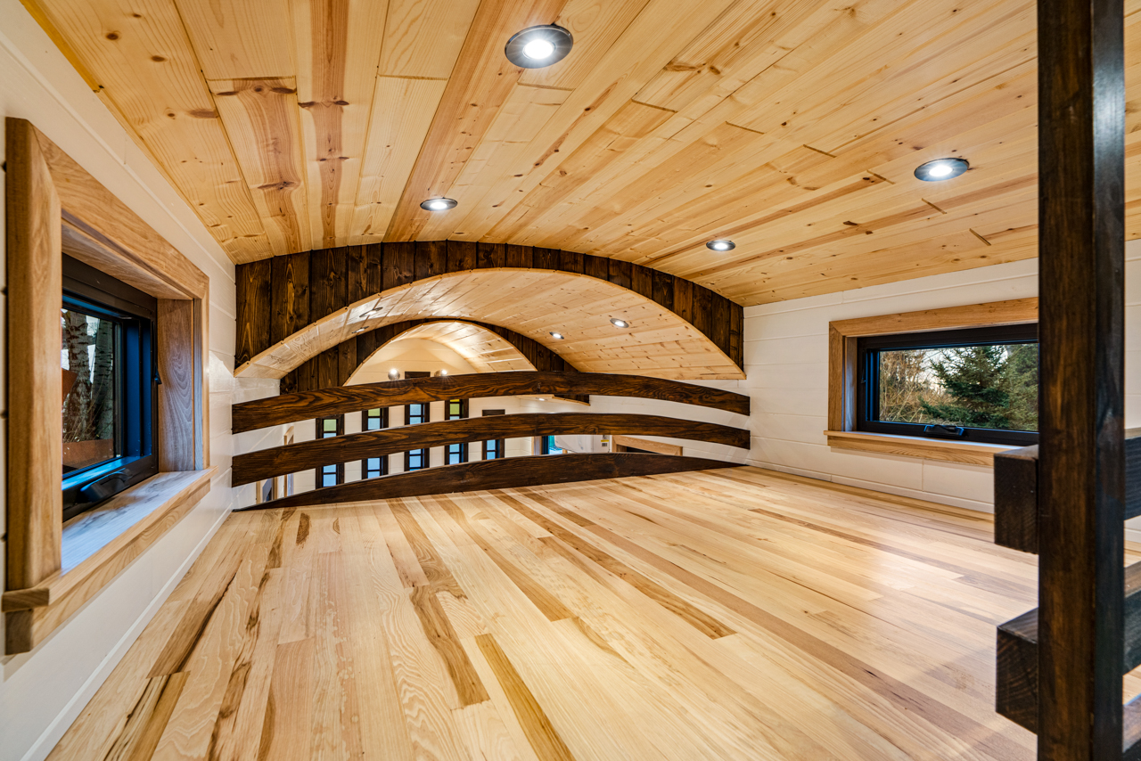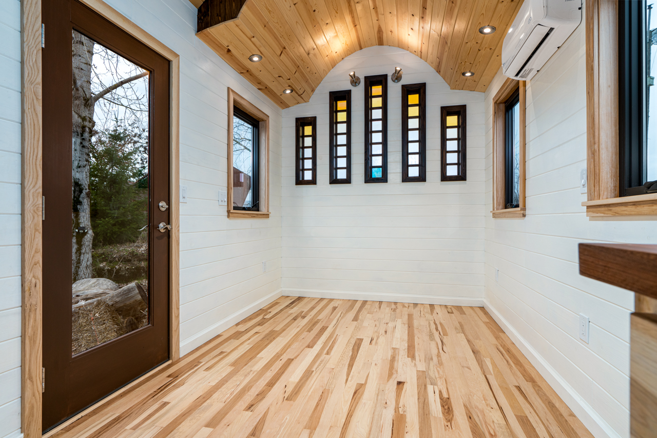 Academics can debate the precise differences between a minipalace and a microcathedral, but this 24’ tiny home was built to give you the best of both. Three tiers of vaulted catenary arches for your ceiling…why not? A custom true divided lite stained glass window…heck, make that five of them! Can’t have an arched shower? Make the motif out of tile! This house also features: