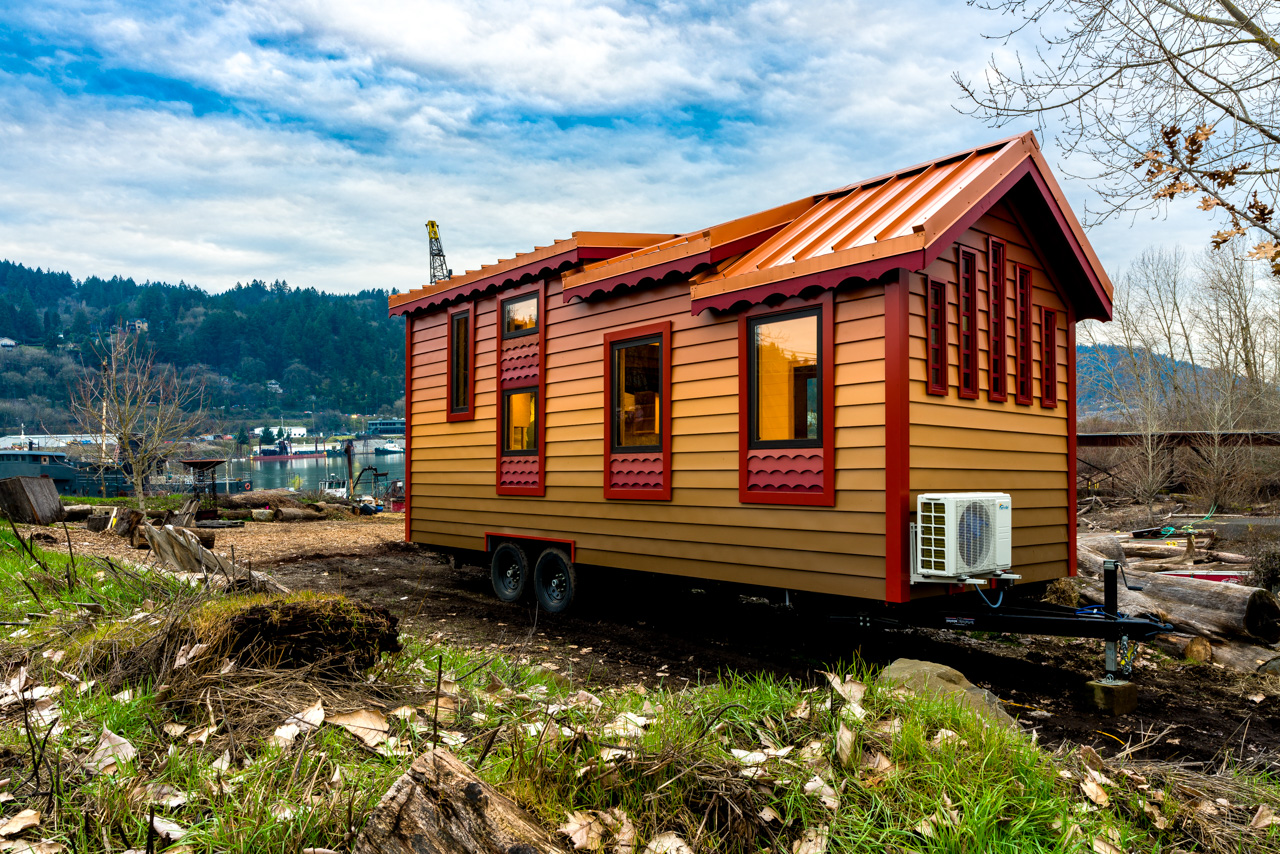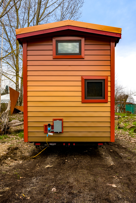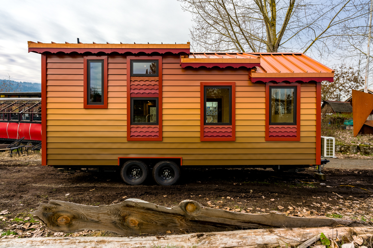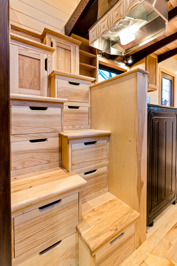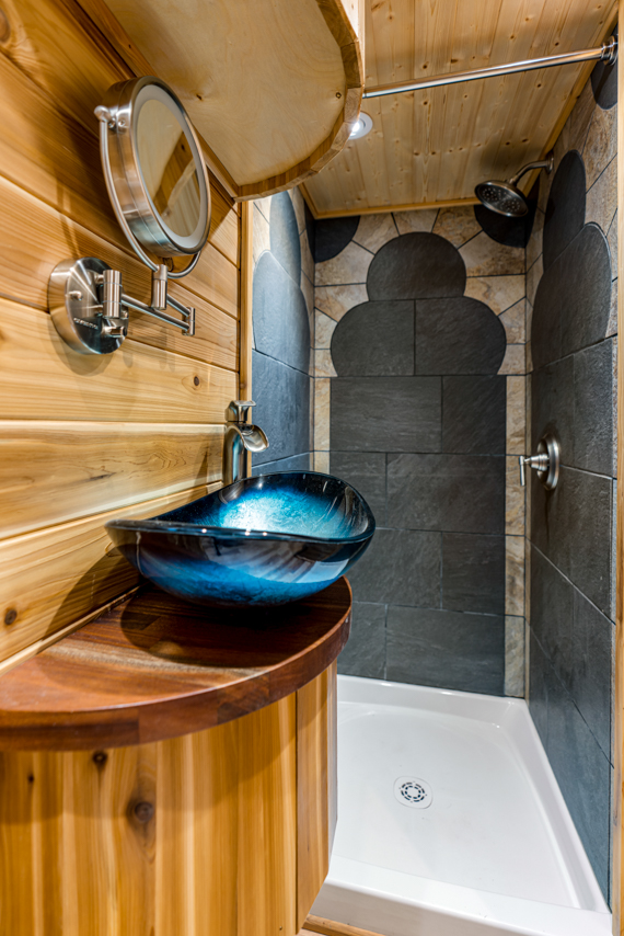 Academics can debate the precise differences between a minipalace and a microcathedral, but this 24’ tiny home was built to give you the best of both. Three tiers of vaulted catenary arches for your ceiling…why not? A custom true divided lite stained glass window…heck, make that five of them! Can’t have an arched shower? Make the motif out of tile! This house also features: