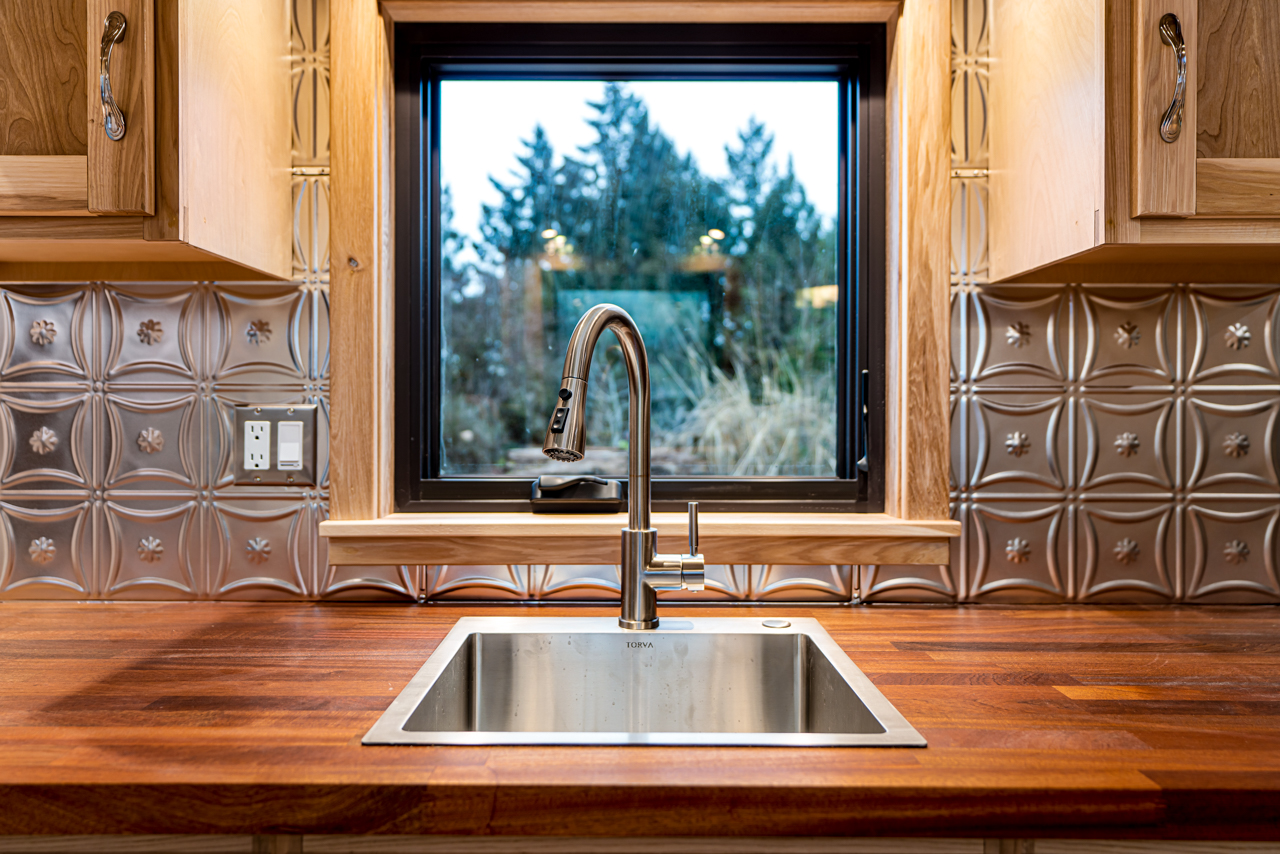 - Custom hickory cabinetry with stamped tin tile backsplashes and sapele butcherblock countertops