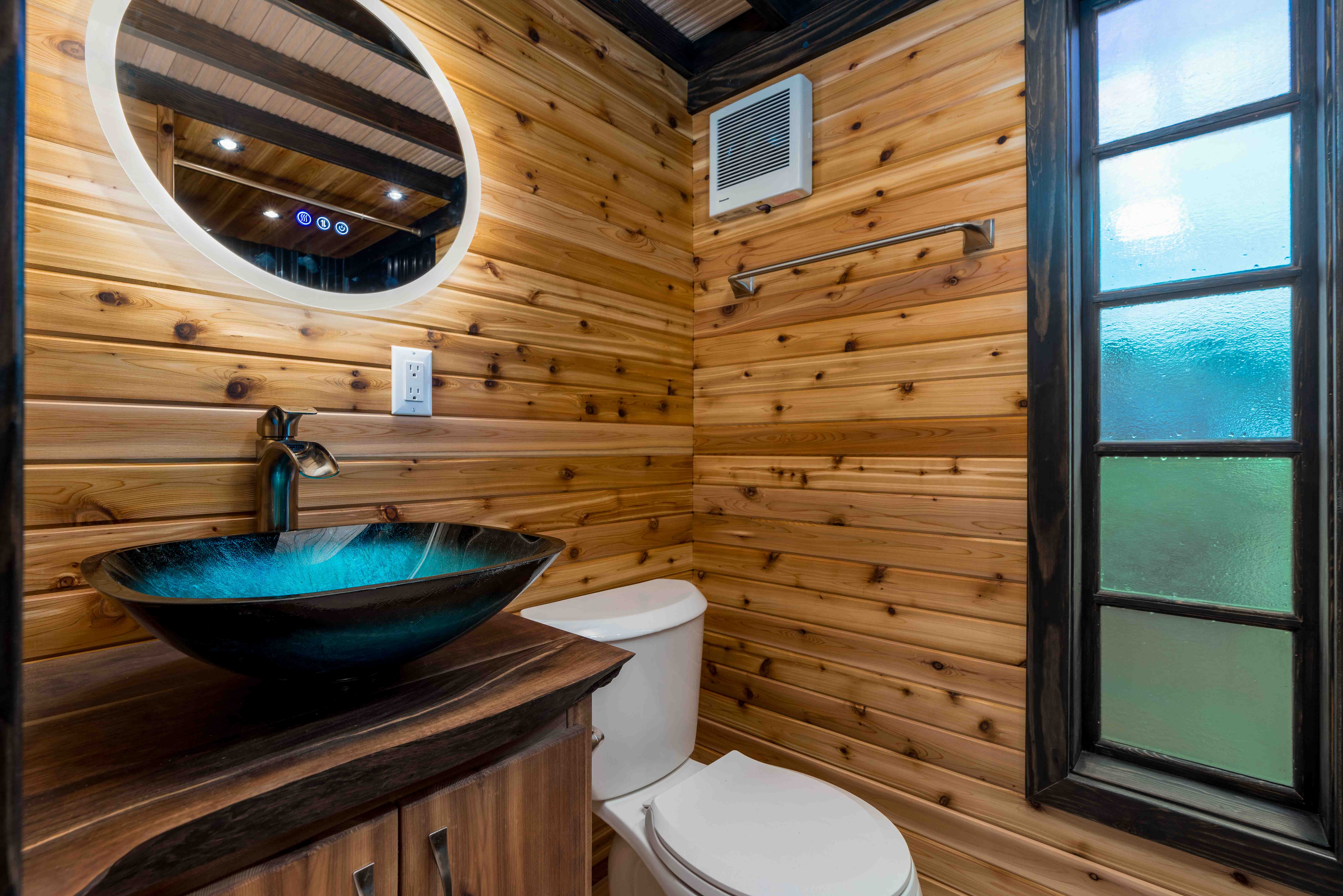 - Flush toilet and custom cedar vanity with solid walnut live-edge countertop and blue glass vessel sink
