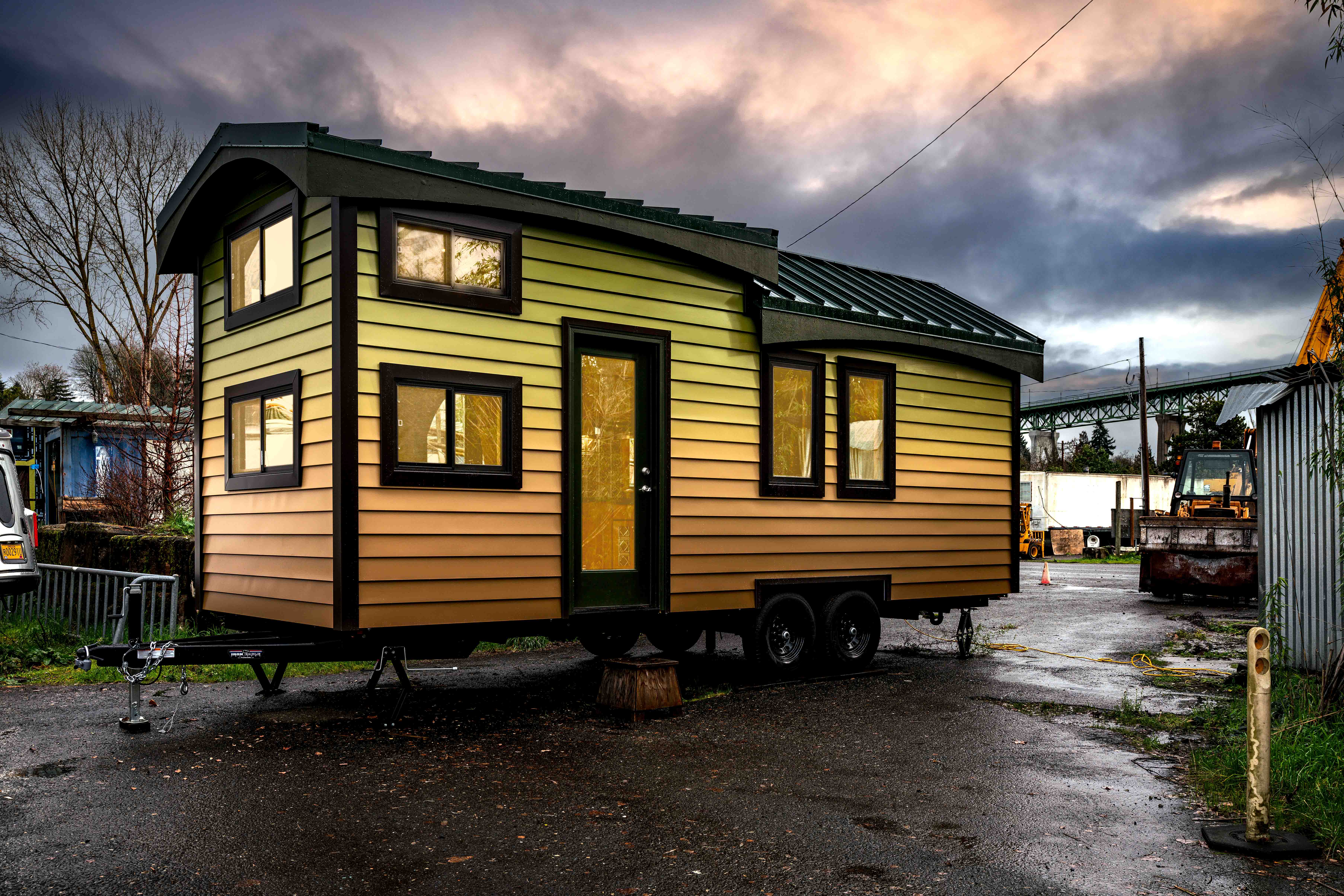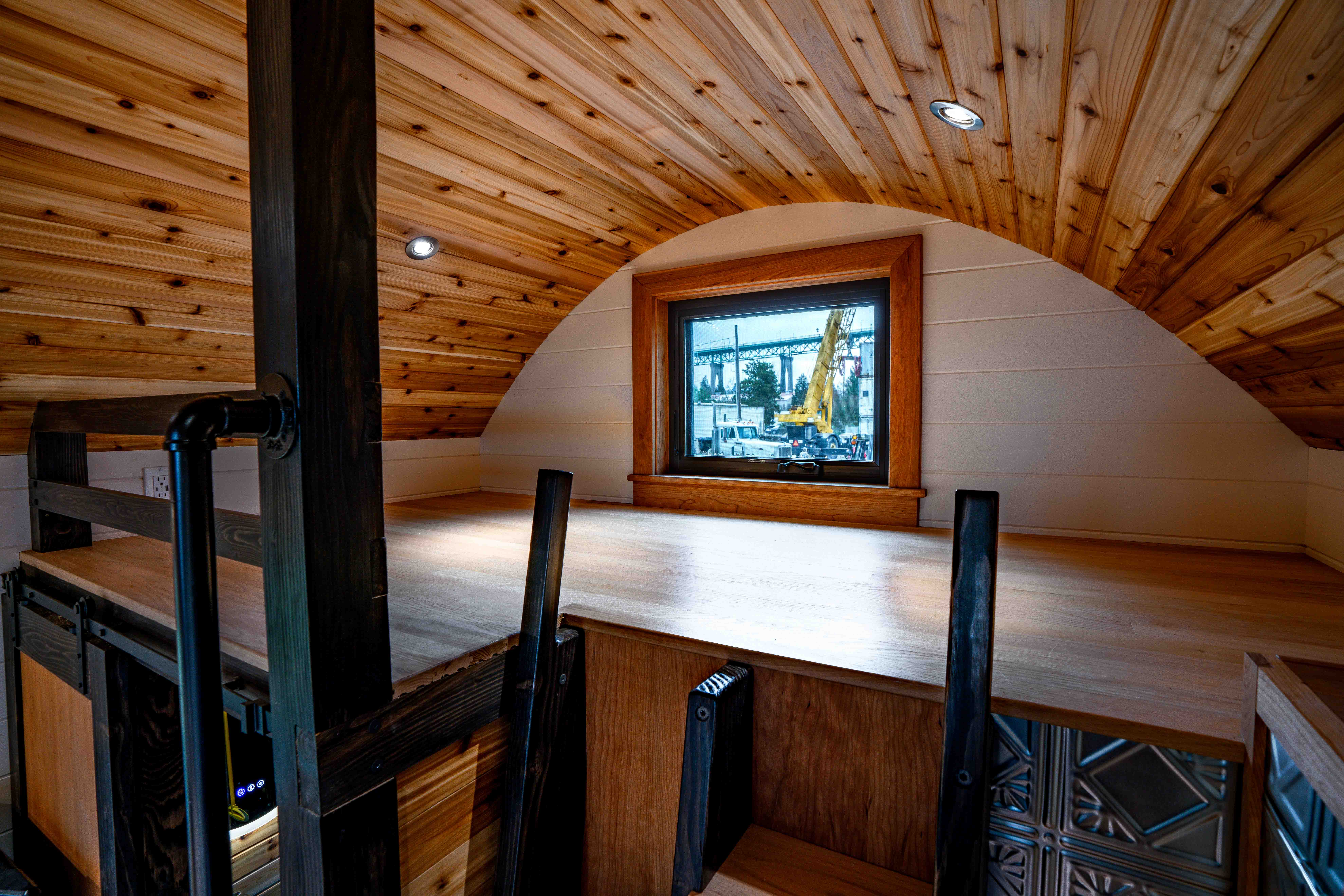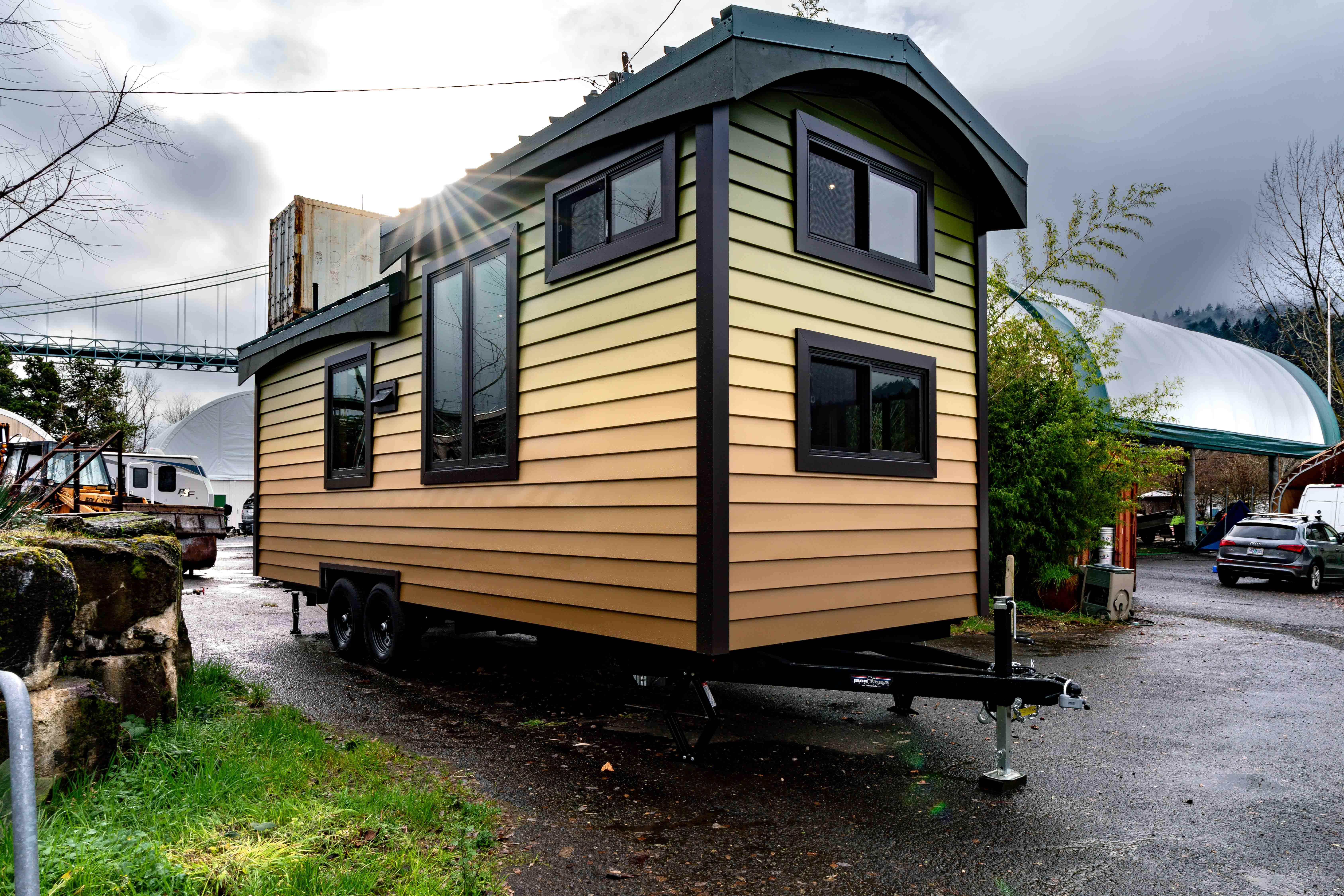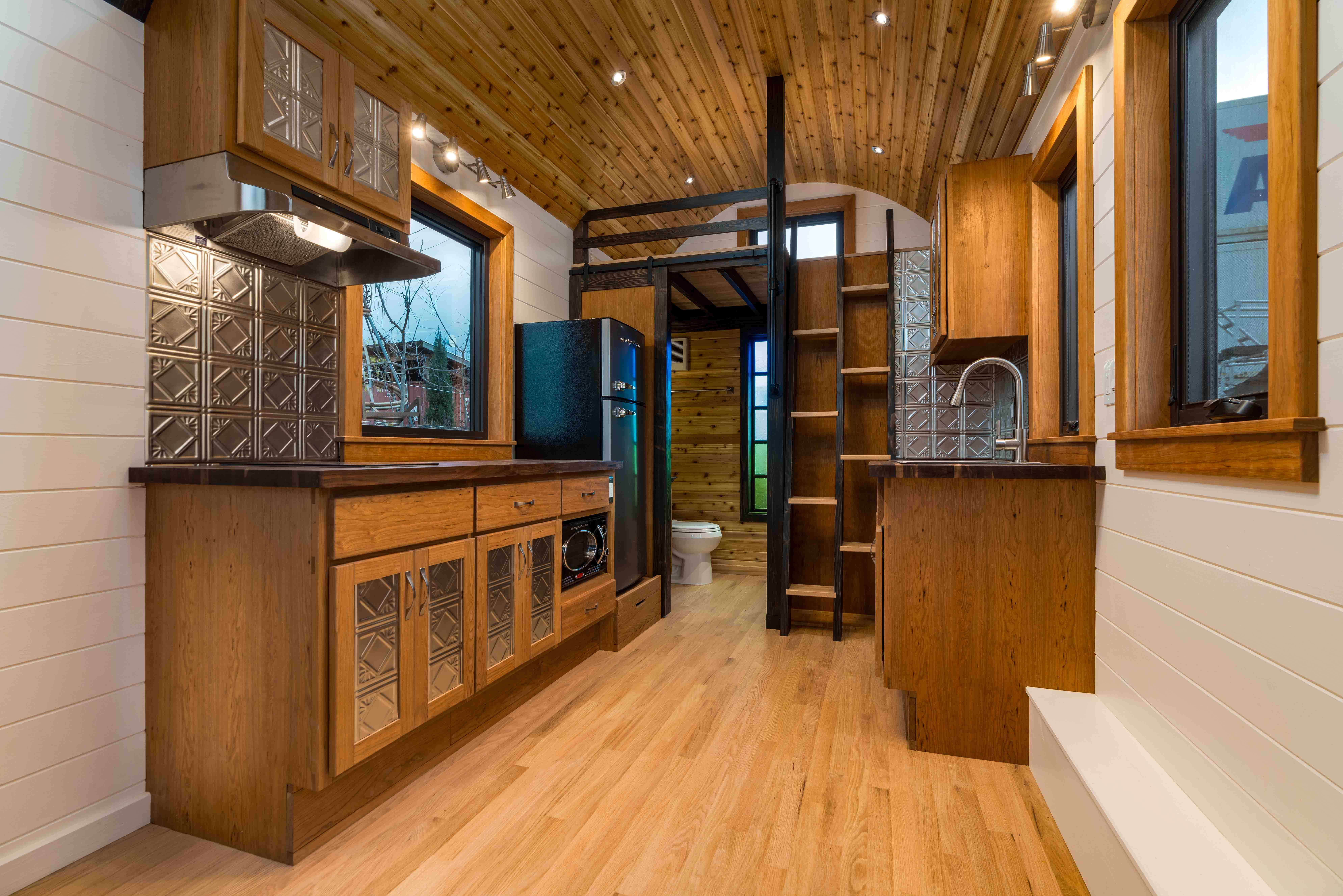 Why waste hours gathering moss when you can buy a tiny home with its moss pre-gathered in the form of ombre paint? In addition to rolling the usual way on the trailer’s wheels, the vaulted arched ceilings mean that you could also roll the house from side to side if you could somehow manage to turn the whole thing upside down and inside out.