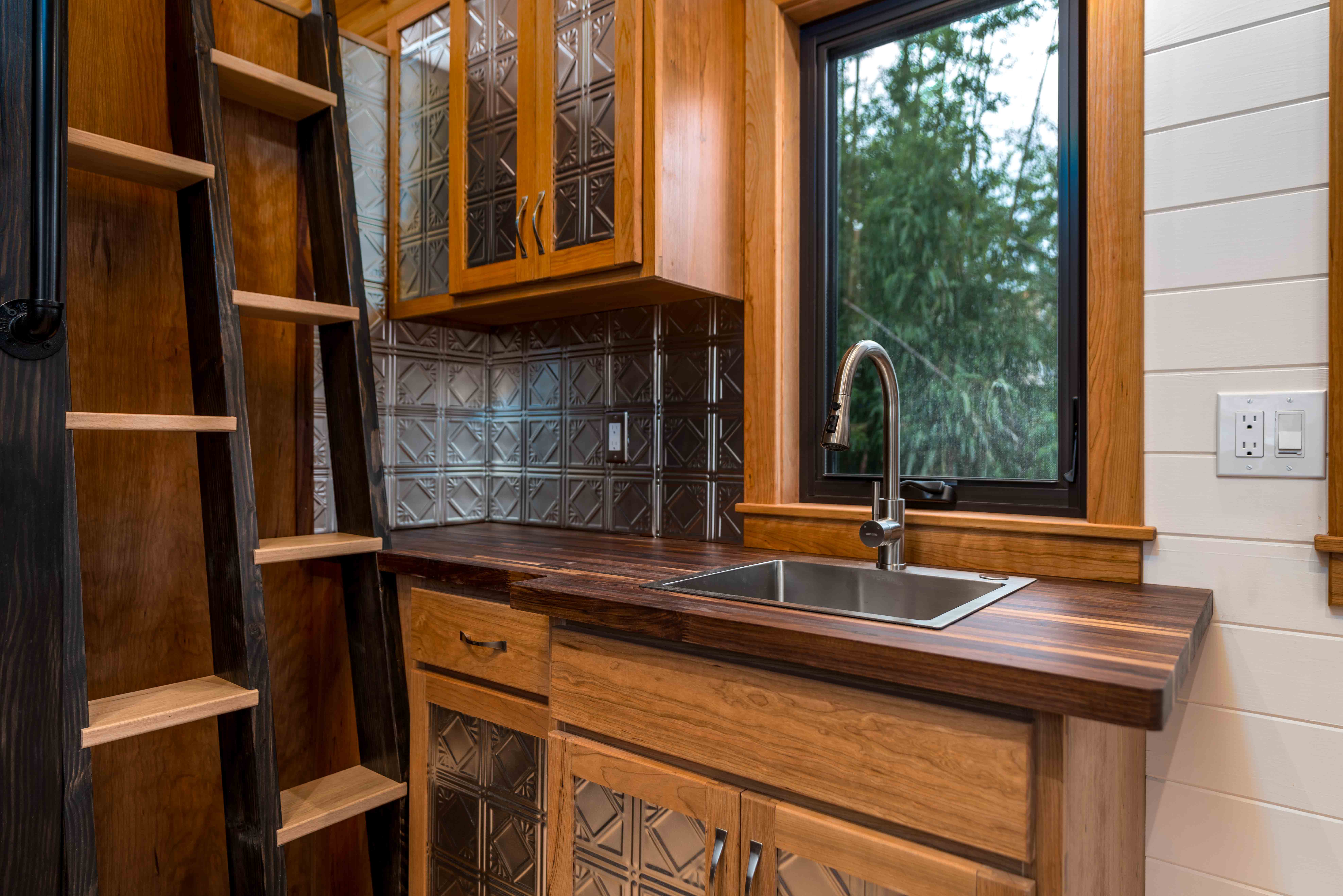 - Custom cherry wood cabinetry with stamped tin tile insets and walnut butcherblock countertops