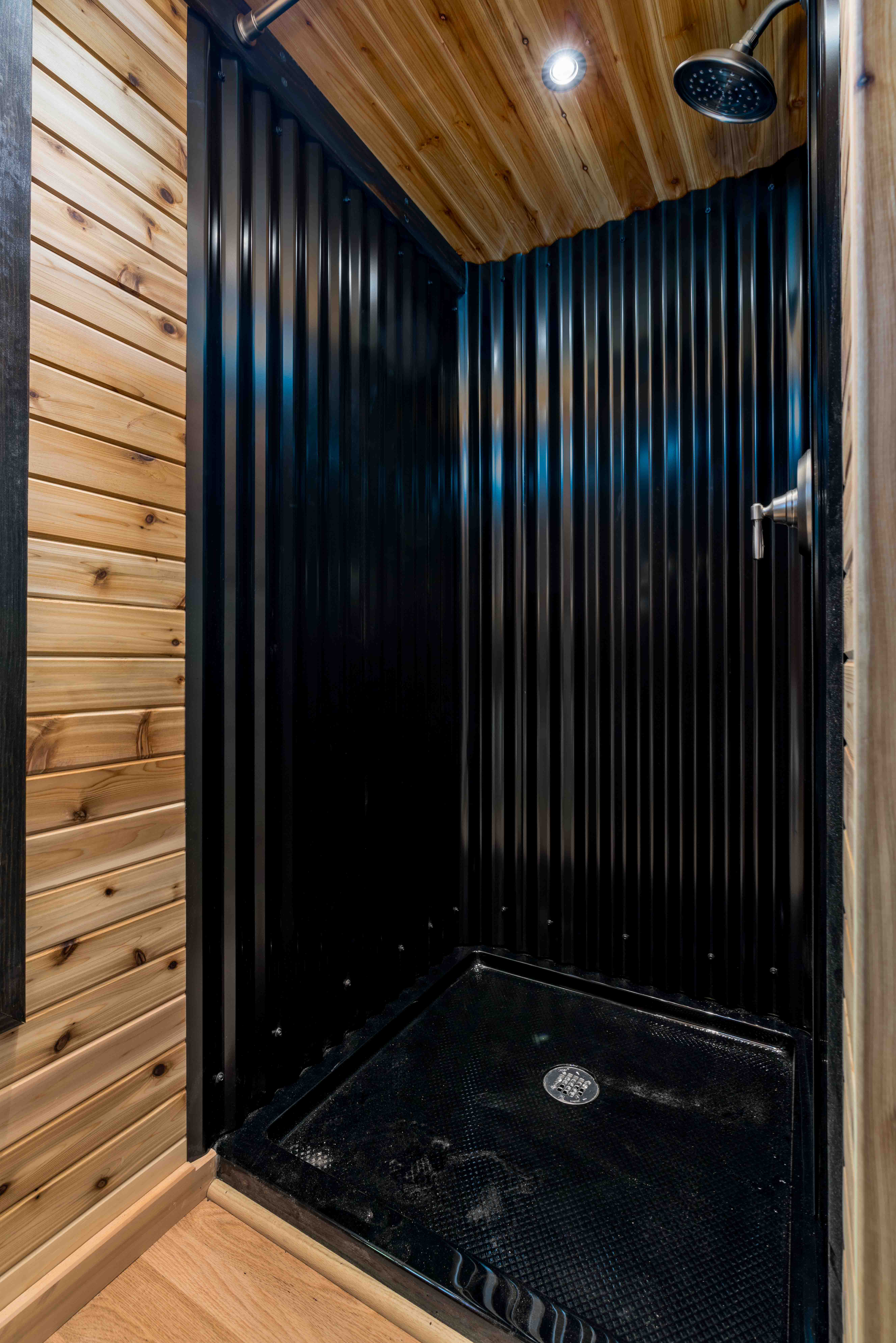 - 36” shower stall in black corrugated metal with brushed nickel fixtures