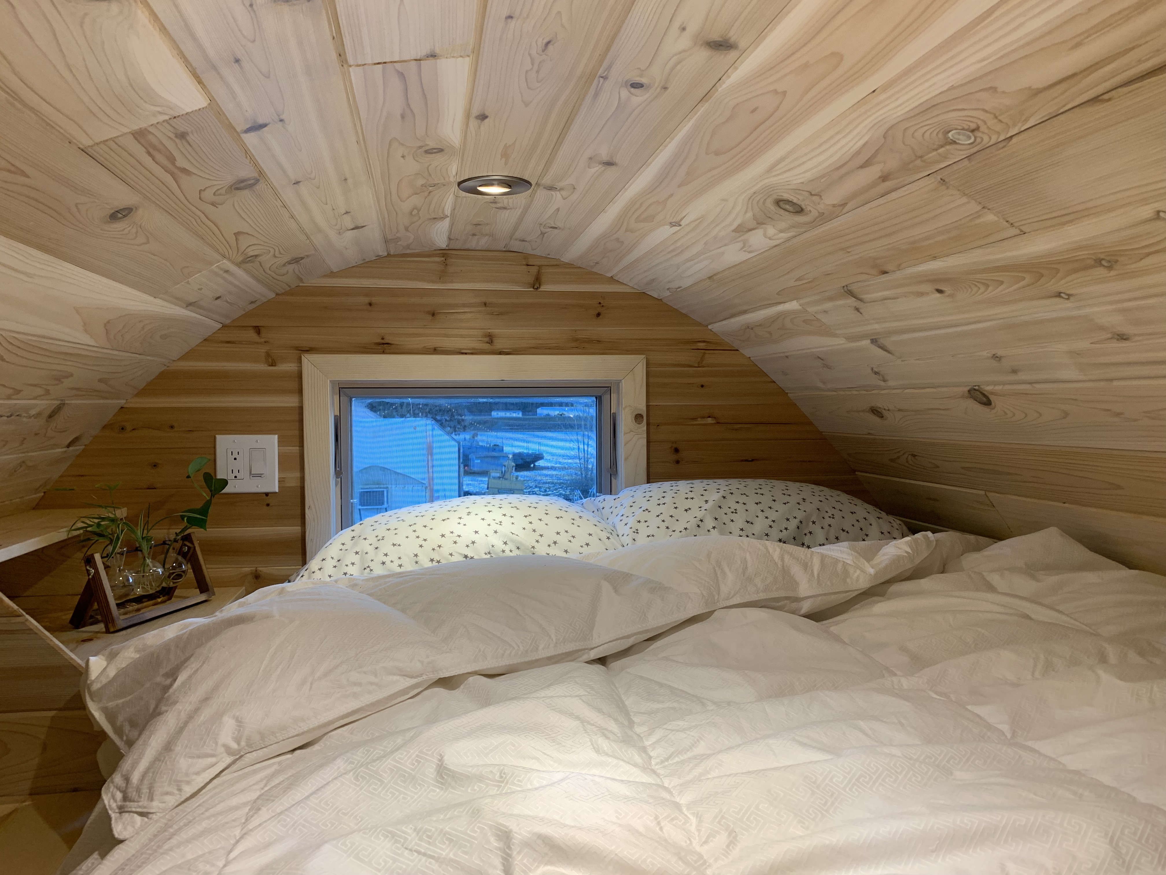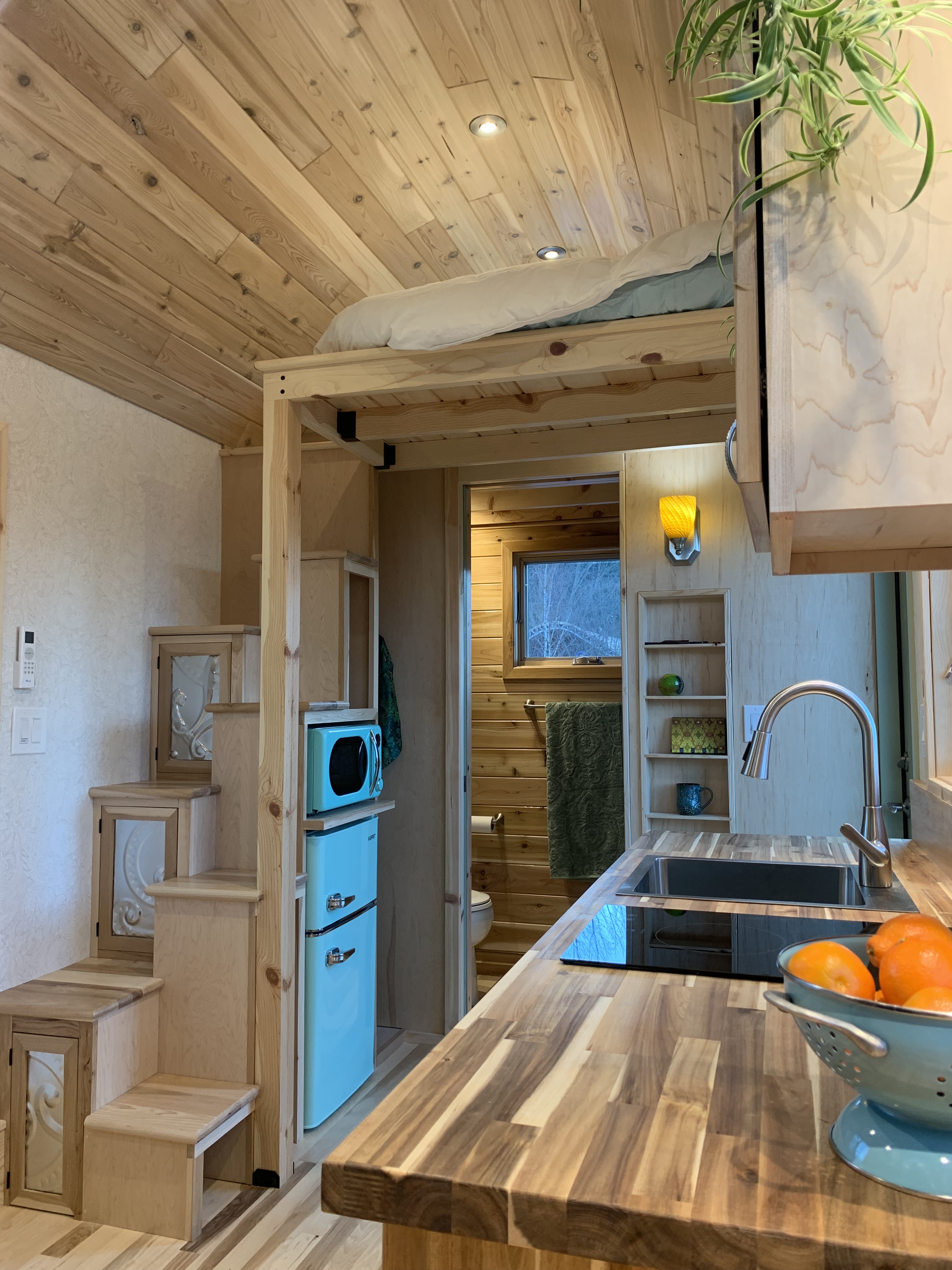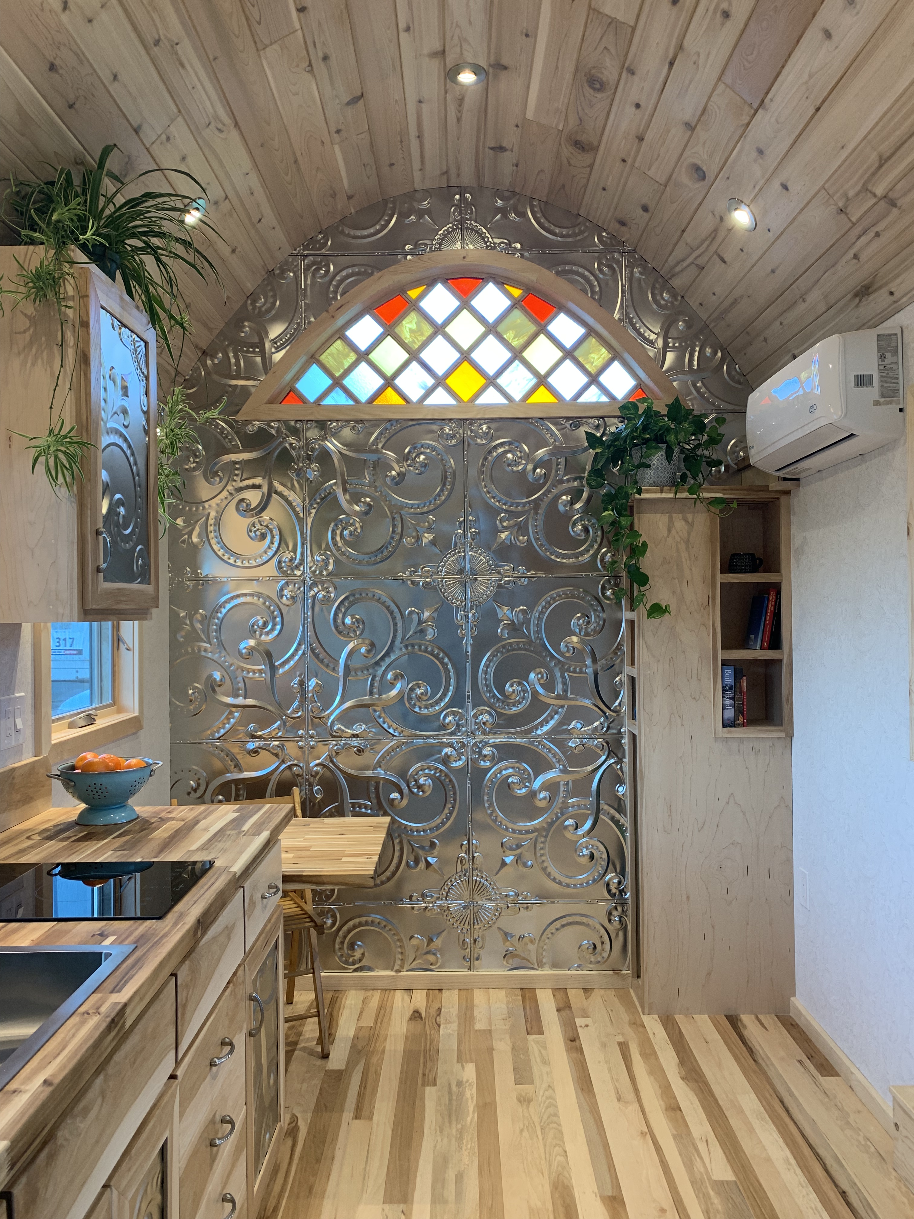 Manic Pixie’s first microcathedral answers the question of whether you can fit a bedroom, bathroom, and kitchen into a 16’ tiny home and still have that cathedral feel. (You can.) This house features: